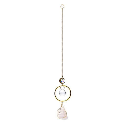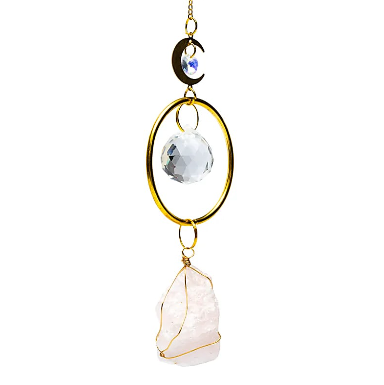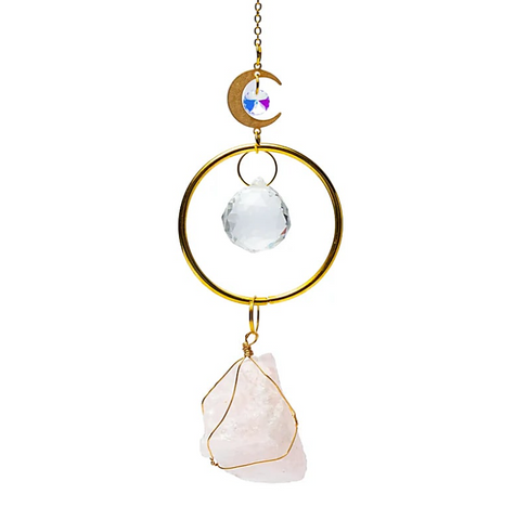 Verschönern Sie Ihr Zuhause und erhöhen Sie Ihre Schwingungen mit diesem Rosenquarz-Mond-Sonnenfänger, einem Symbol der Liebe und des energetischen Gleichgewichts.