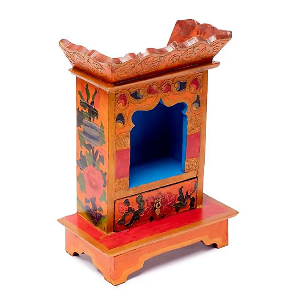 Dieser handbemalte buddhistische Altar ist perfekt für diejenigen, die eine tägliche spirituelle Praxis in ihr Leben integrieren möchten. Mit seinem authentischen Design und Stauraum ist er ideal für Menschen, die einen kompakten, aber funktionalen Altar suchen. Es ist auch ein hervorragendes Dekorationsobjekt, das Ruhe und Gelassenheit in Ihren Wohnraum einlädt.