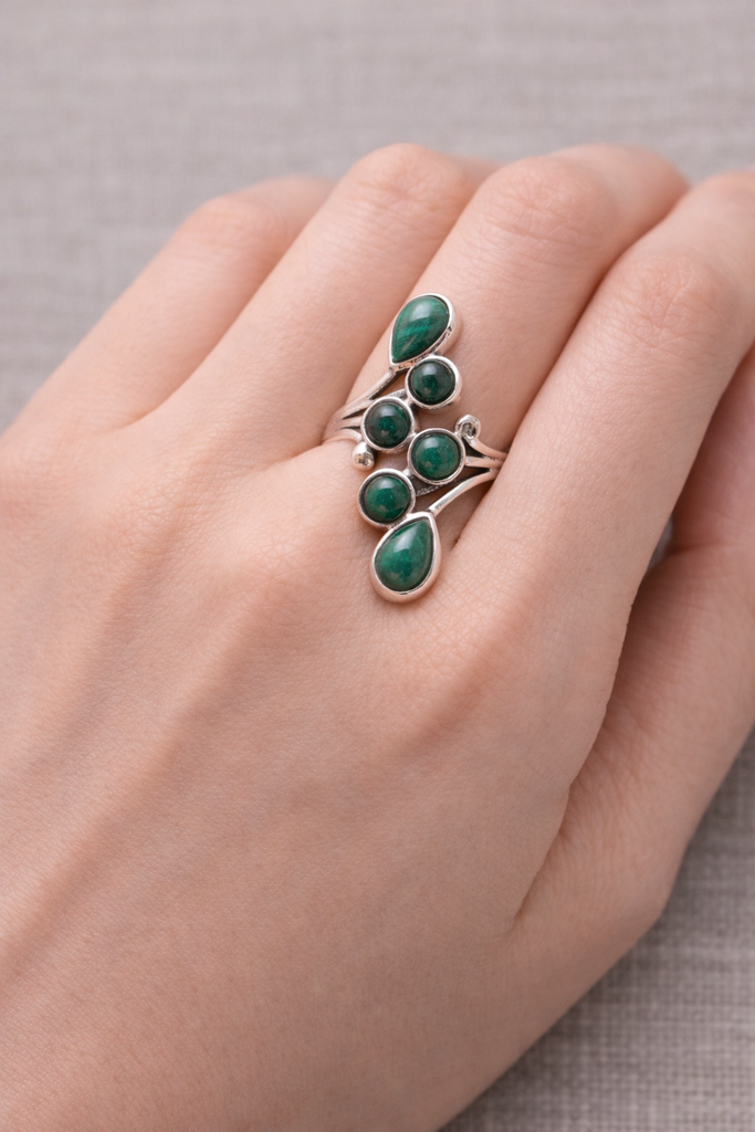 Der Ring „Atem der Erneuerung“ aus 925er Sterlingsilber und natürlichem Malachit lädt zu bewusster Transformation und zum Hören auf das Herz ein. Sein fließendes Design, die tiefgrünen Farbtöne und die schützende Energie machen ihn zu einem eleganten und bedeutungsvollen Schmuckstück, das Sie in jeder Lebensphase mit Stärke, Sanftmut und Weisheit begleiten kann.