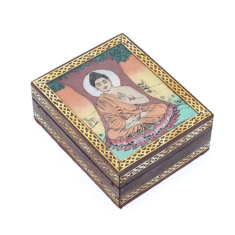 Saraswati-Sand : Der Deckel ist sorgfältig mit feinem Sand vom Ufer des heiligen Saraswati-Flusses verziert, der traditionell für spirituelle Gemälde und Mandalas verwendet wird. Dieser farbige Sand verleiht der Box einen authentischen Glanz, aufgeladen mit positiven Schwingungen.