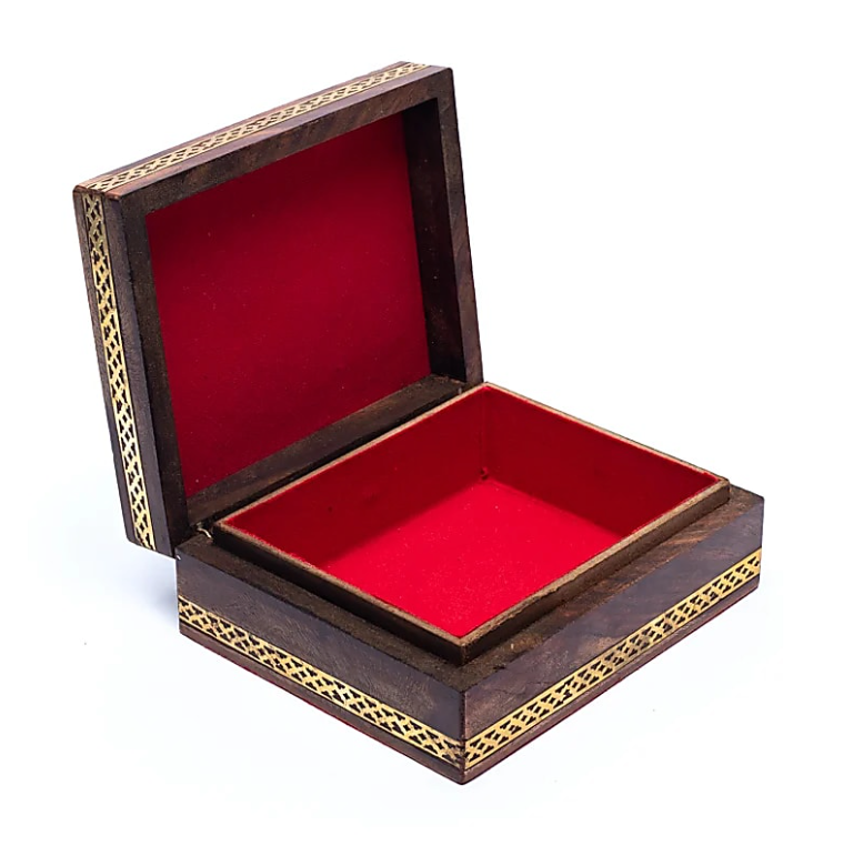 Diese in traditionellen indischen Werkstätten handgefertigte Box ist das Ergebnis jahrhundertealten Know-hows. Jedes Detail ist sorgfältig ausgearbeitet: das polierte Holz, der von Hand aufgetragene farbige Sand, der sorgfältig gemeißelte Messingrahmen. Jedes Exemplar ist ein Unikat mit seiner eigenen energetischen Note.