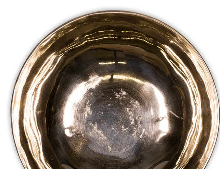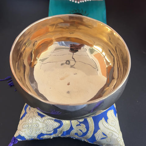 - Handgefertigte Klangschale aus Kupfer, Zinn und 8 Edelmetallen (Ag, Ni, Cd, Ru, Pd, Pt, Cr, Mn).