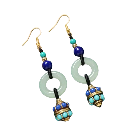 - Tibetische Ohrringe aus Kupfer und Natursteinen: Jade, Lapislazuli, Türkis, vergoldetes Kupfer und Messing