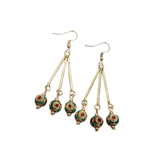 Ihr einzigartiges Design aus dünnen goldenen Stielen und Perlen mit Türkis und roter Koralle erinnert an die fließende Bewegung tibetischer Gebetsfahnen, die vom Wind getragen werden und positive und wohlwollende Energien verbreiten. Diese Ohrringe vereinen somit Ästhetik und tiefe Bedeutung und machen sie zu einem Schmuckstück, das zugleich mystisch und raffiniert ist.