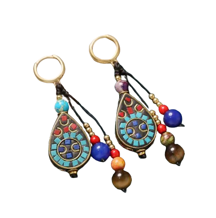 - Ohrringe aus tibetischem Kupfer und Natursteinen: Türkis, Lapislazuli, Tigerauge und rote Koralle