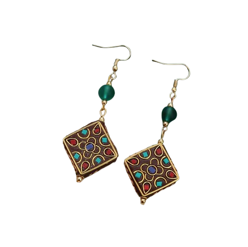 Die Ohrringe „Sacred Mandala“ sind eine Hommage an die spirituelle Kunst Tibets und Nepals. Sie bestehen aus vergoldetem Messing und sind mit rekonstruiertem Türkis und Korallen besetzt. Sie zeigen ein sorgfältig graviertes Mandala-Motiv, das die Harmonie des Universums und das innere Gleichgewicht symbolisiert. Zusammen mit grünen Glasperlen verleihen sie Ihrem Stil eine elegante und mystische Note.