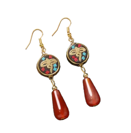 - Ohrringe aus tibetischem Kupfer und Natursteinen: Karneol, Türkis, rote Koralle und vergoldetes Messing