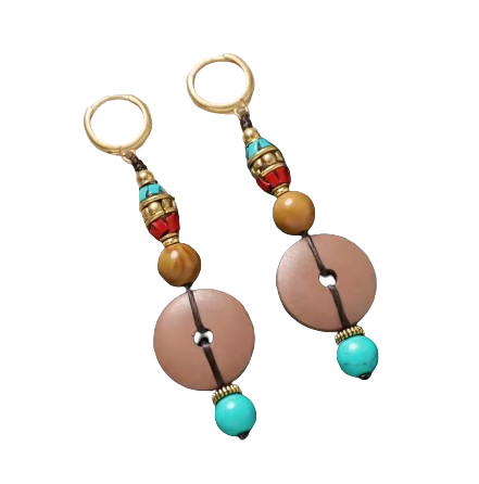 - Ohrringe aus tibetischem Kupfer und Natursteinen: Türkis, rote Koralle, Tigerauge, Naturholz und vergoldetes Kupfer