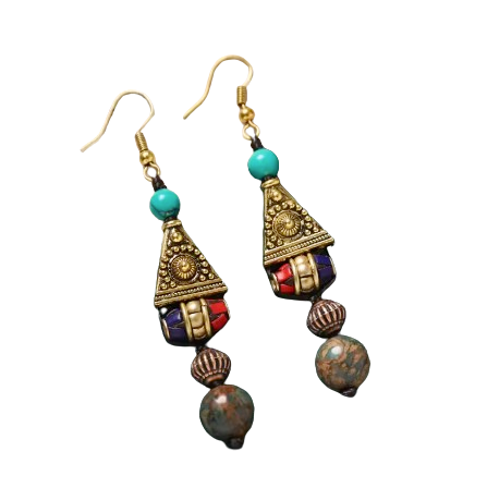 - Ohrringe aus tibetischem Kupfer und Natursteinen: Türkis, rote Koralle, Lapislazuli, Landschaftsjaspis und vergoldetes Kupfer