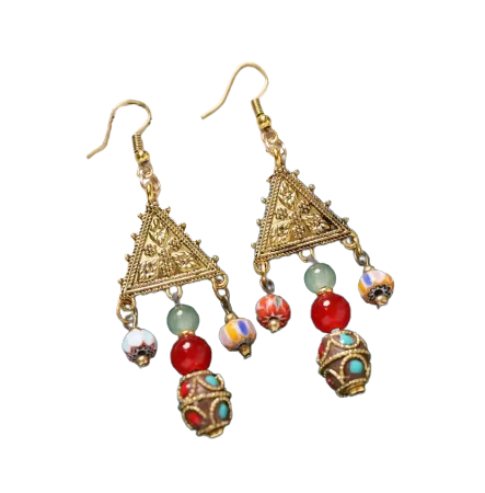 - Ohrringe aus tibetischem Kupfer und Natursteinen: Türkis, Karneol, grüner Aventurin, farbige Glasperlen, Holz, vergoldetes Messing