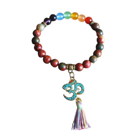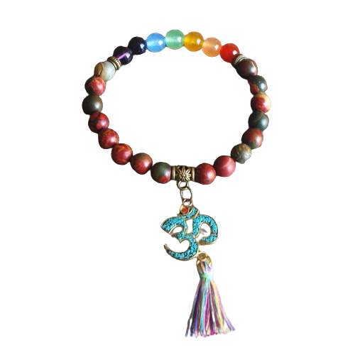 Tragen Sie dieses 7-Chakra-Armband mit Om-Amulett, um Ihre Energien auszugleichen, das körperliche und emotionale Wohlbefinden zu fördern und Ihre spirituelle Praxis durch die Kraft der Halbedelsteine und des Om-Symbols zu vertiefen.