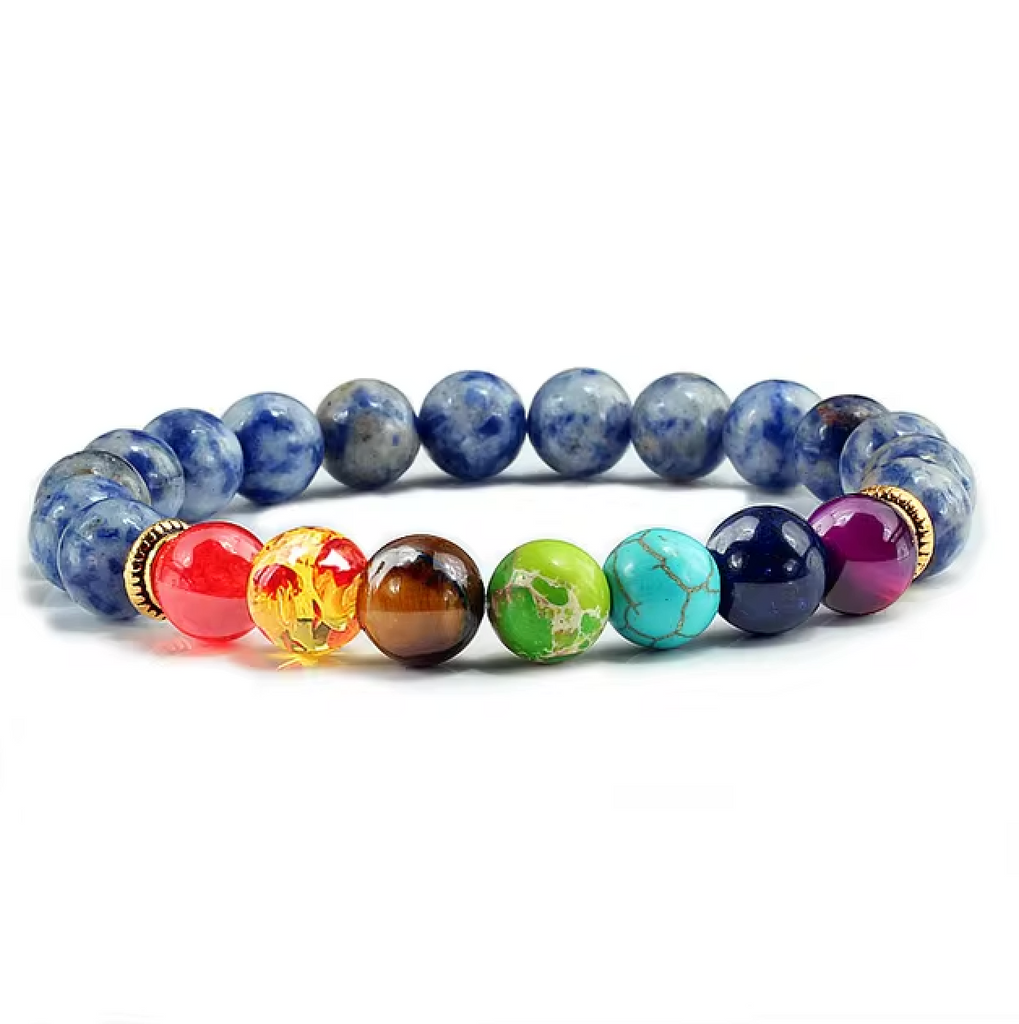 Dieses 7-Chakra-Howlith-Armband besteht zusätzlich zu den 7 Steinen, die die Chakren darstellen, aus Howlith, der mit dem Kronen-, Herz- und dritten Auge-Chakra verbunden ist. Es wirkt als starker Stabilisator auf den Geist und die Gefühle.