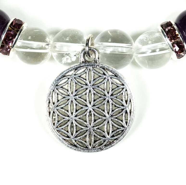 Amethyst, Bergkristall und die Blume des Lebens bilden eine perfekte Synergie: