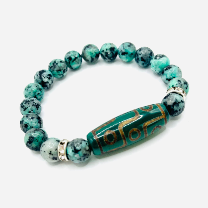 Die drei Augen der Dzi-Perle stehen für göttliche Vision und die Verbindung mit spirituellen Kräften. Sie symbolisieren auch materiellen Wohlstand, körperliche Gesundheit und spirituelle Erfüllung. Im Buddhismus werden die drei Augen oft als Öffnung zu höherer Weisheit und spiritueller Intuition interpretiert. Dieses Armband stärkt den Meditationszustand und intensiviert die Wirkung buddhistischer Gebete. Gleichzeitig bringt es Schutz und Fülle.