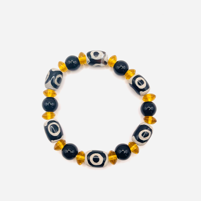 In der buddhistischen Tradition steht der dreiäugige Dzi für spirituelle Erhebung durch Gebet. Er wird mit Heilkräften, Wohlstand und göttlichem Schutz in Verbindung gebracht. Diese Perle soll Türen zum Glück öffnen und gleichzeitig die Verbindung des Trägers zu den Segnungen Buddhas stärken und so zu größerer spiritueller und geistiger Klarheit führen.
