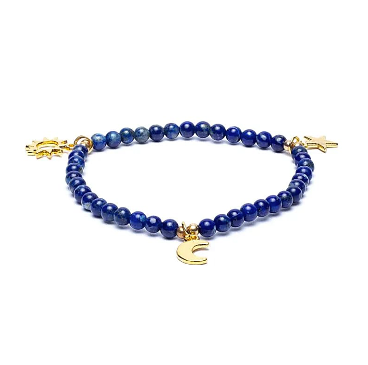 Dieses mit himmlischen Amuletten verzierte Lapislazuli-Armband ist viel mehr als nur ein Accessoire: Es ist ein Talisman der Harmonie zwischen Ihrer inneren Welt und dem Universum. Es erinnert Sie daran, dass Sie zugleich ein Stern auf dem Weg, ein Licht des Tages und ein Mysterium der Nacht sind.