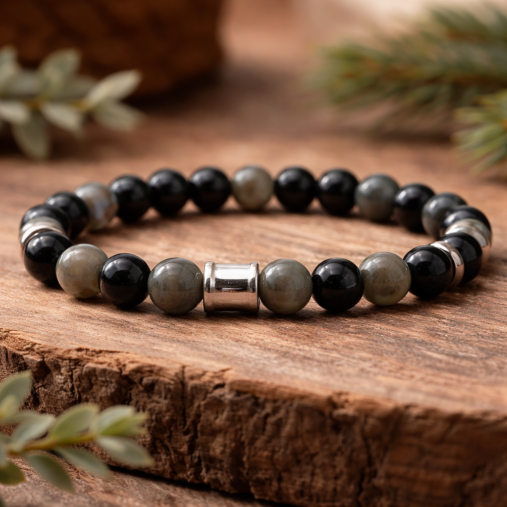Das Armband „Intuition & Schutz“ aus Labradorit und schwarzem Onyx vereint Schutz und Eleganz und ist das perfekte Schmuckstück für alle, die Stil, Energie und innere Balance verbinden möchten. Sein zeitloses Design und die Natursteine ​​machen es zu einem ebenso ästhetisch ansprechenden wie symbolträchtigen Accessoire.