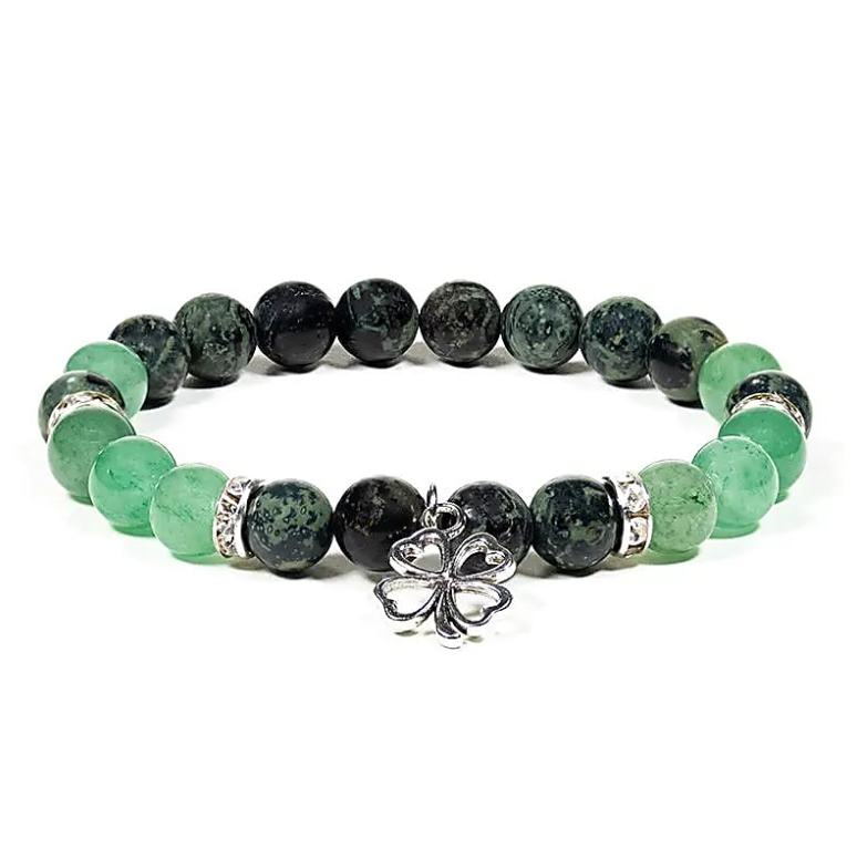 Gönnen Sie sich dieses Armband aus Kambaba-Jaspis und Aventurin mit einem Kleeblatt-Anhänger, um Glück und Gelassenheit in Ihren Alltag zu bringen!