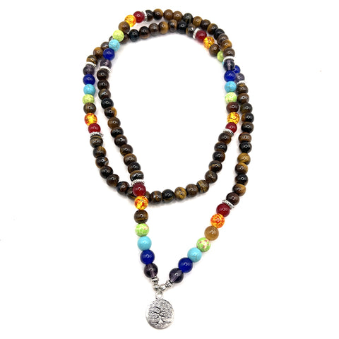 Das 7-Chakra-Mala-Armband besteht aus Perlen und Natursteinen, die jedem Chakra entsprechen: