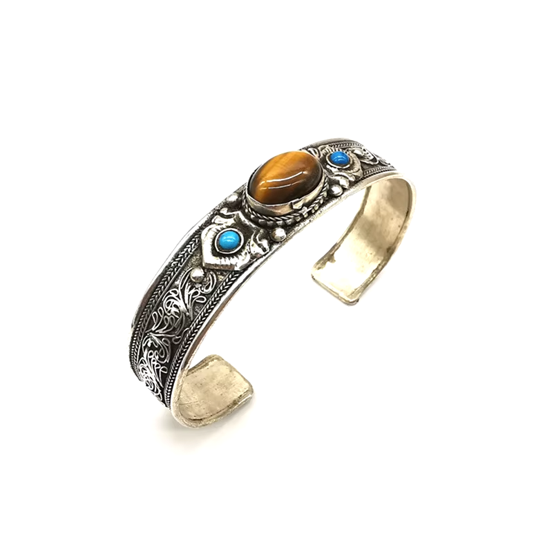 Lassen Sie sich von der Kraft dieses tibetischen Armbands aus Kupfer und Tigerauge verführen, einem Juwel, das sowohl schützend als auch elegant und voller spiritueller Symbolik ist.