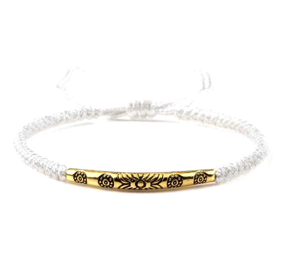 Sichere SSL-ZahlungDieses tibetisch-buddhistische Armband wird von Kunsthandwerkern aus sorgfältig geflochtenem Seil gefertigt, das in der buddhistischen Tradition Schutz und Glück symbolisiert. Der goldene Stab ist mit schützenden buddhistischen Symbolen graviert, die Harmonie und positive Energie bringen. Dank seines verstellbaren Designs kann es an jedem Handgelenk getragen werden und passt sich leicht an unterschiedliche Größen an.