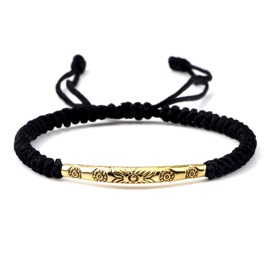 Dieses tibetisch-buddhistische Armband wird von Kunsthandwerkern aus sorgfältig geflochtenem Seil gefertigt, das in der buddhistischen Tradition Schutz und Glück symbolisiert. Der goldene Stab ist mit schützenden buddhistischen Symbolen graviert, die Harmonie und positive Energie bringen. Dank seines verstellbaren Designs kann es an jedem Handgelenk getragen werden und passt sich leicht an unterschiedliche Größen an.