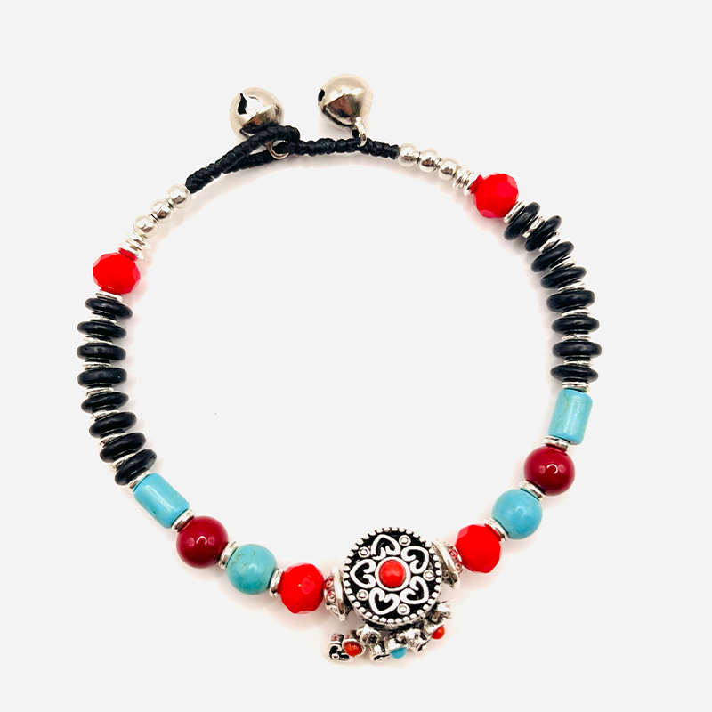 Das zentrale Medaillon, verziert mit traditionellen tibetischen Motiven, ist ein Symbol für Harmonie und spirituelle Verbundenheit. Die kleinen hängenden Anhänger erinnern an fließende, energetische Bewegungen, wie einen lebendigen Tanz der Elemente.