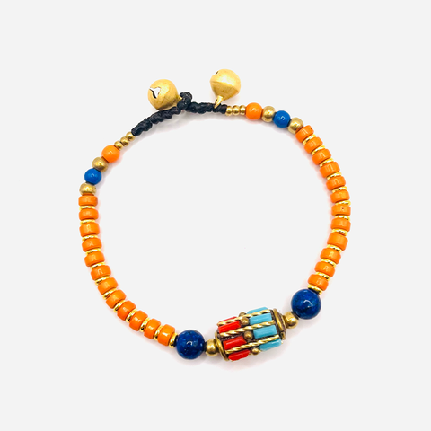 Der zentrale Talisman, verziert mit traditionellen tibetischen Motiven, stellt eine Miniatur-Gebetsmühle dar, die an buddhistische spirituelle Praktiken erinnert. Es symbolisiert die Übermittlung von Gebeten und wohlwollenden Energien an das Universum.