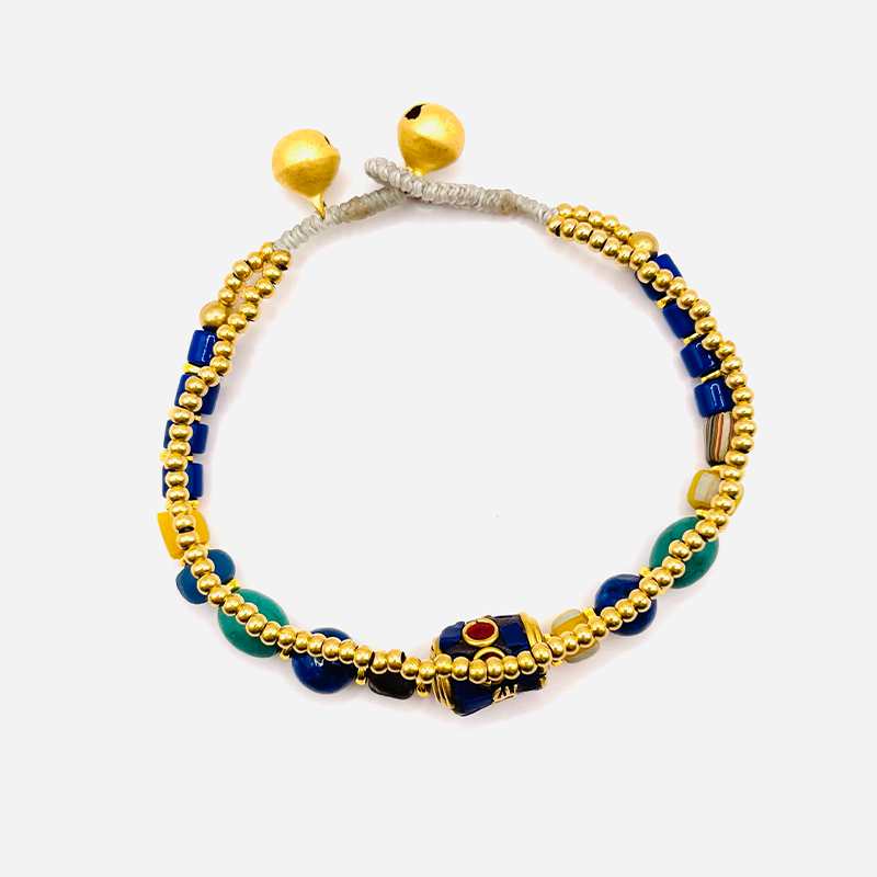 In der Mitte des Armbandes befindet sich ein mit Lapislazuli eingelegter Metallzylinder mit einem heiligen buddhistischen Mantra. Dieses kraftvolle Symbol erinnert uns ständig an die Bedeutung von Meditation und liebevoller Güte in unserem täglichen Leben.