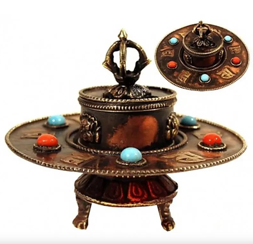 Sichere SSL-Zahlung Dieser tibetische Räuchergefäß ist ein wahres handgefertigtes Schmuckstück, das Ihre spirituellen Übungen begleitet oder Ihre Wohnräume mit Eleganz und Symbolik schmückt. Er besteht aus robustem, fein verarbeitetem Metall und ist mit roten und blauen Halbedelsteinen verziert, die Stärke und Gelassenheit symbolisieren. An seiner Spitze befindet sich ein halbes Dorje, ein kraftvolles Symbol für Schutz und Ausgeglichenheit in der tibetisch-buddhistischen Tradition.