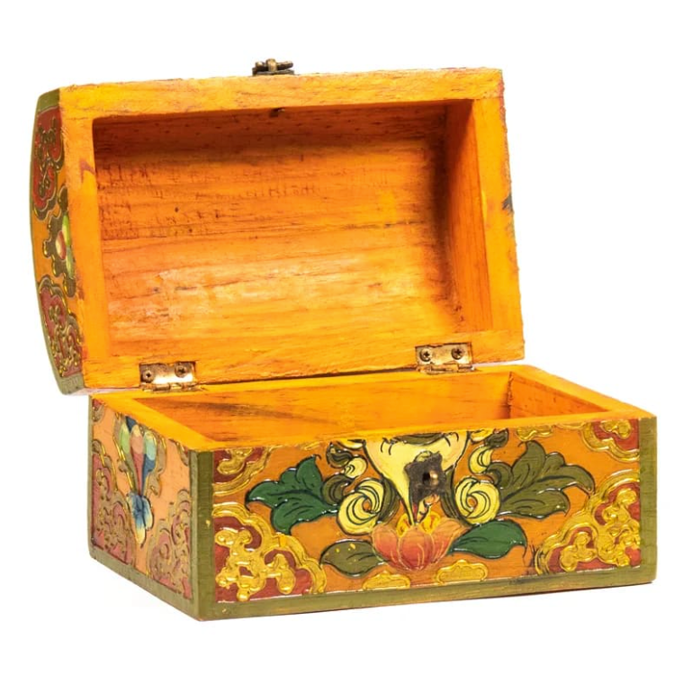 Handgeschnitztes und handbemaltes Massivholz : Jede Schatulle wird im Himalaya in Handarbeit nach der Tradition tibetischer Ritualgegenstände gefertigt. Das Holz wird von Hand bearbeitet, patiniert und mit natürlichen Pigmenten verziert.