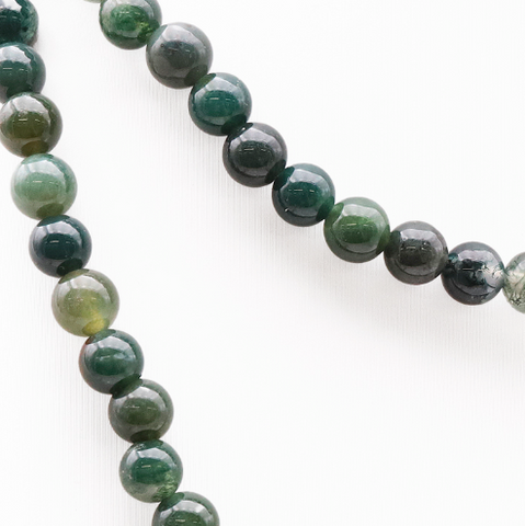 Diese Halskette besteht aus 6 mm großen, runden Perlen aus natürlichem Moosachat der Güteklasse A und besticht durch ihre organische und einzigartige Ästhetik. Jede Perle weist individuelle Grüntöne auf, die sich mitunter mit Transparenz oder milchigem Weiß vermischen und so jede Kette zu einem wahren Unikat machen.