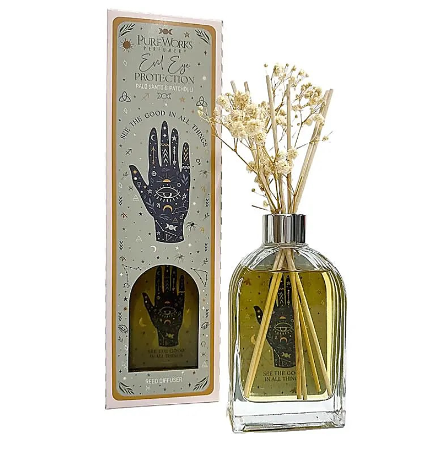 Sichere SSL-Zahlung Schützen Sie Ihren Raum und steigern Sie Ihre Energie mit diesem botanischen Diffusor, inspiriert von alten Schutzsymbolen. Dieser Evil Eye Protector aus der Celestial Magic Kollektion kombiniert mystische Ästhetik mit einem betörenden Duft und verwandelt Ihr Zuhause in eine Oase der Ruhe. Angereichert mit heiligem Palo Santo und erdigem Patchouli verbreitet er einen beruhigenden, holzigen Duft, der reinigt und die Erdung fördert.