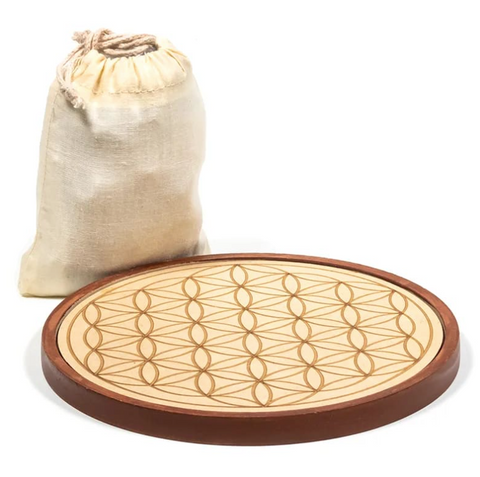 Die Blume des Lebens dient als Grundlage des Kristallrasters und dient als energetischer Resonator , der die Schwingungen der Kristalle strukturiert und verstärkt und gleichzeitig die Heilenergie in Richtung einer bestimmten Absicht kanalisiert.
