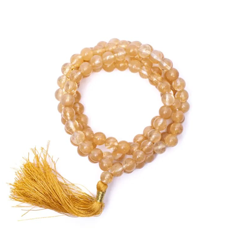 Diese Mala aus 108 goldenen Quarzperlen erhellt Ihren spirituellen Weg und bringt Wohlstand und Wohlbefinden in Ihr Leben. Ein energetisches Juwel mit wohltuenden Eigenschaften, perfekt für alle, die Gelassenheit und innere Harmonie suchen.