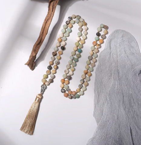 Zusammensetzung: Eine Mala besteht normalerweise aus 108 Perlen , obwohl einige kürzere oder spezielle Malas eine andere Anzahl von Perlen haben können. Zusätzlich zu den Perlen enthält eine Mala oft eine größere Perle, die sogenannte „Guru-Perle“, sowie eine kleine Quaste.