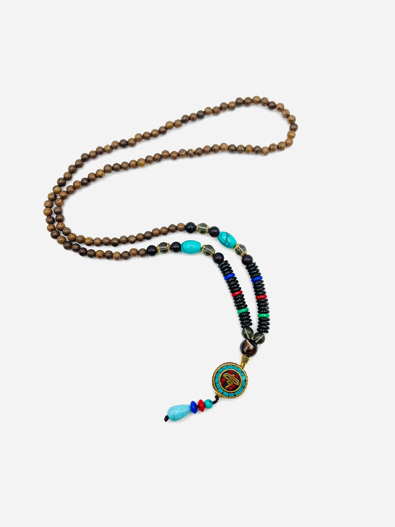 Im Herzen des Anhängers stellt das goldene, runde Medaillon ein stilisiertes spirituelles Symbol dar, umgeben von Einlagen aus Türkis, roter Koralle und Lapislazuli. Es erinnert an die schützenden Mantras oder heiligen Silben der buddhistischen Weisheit.
