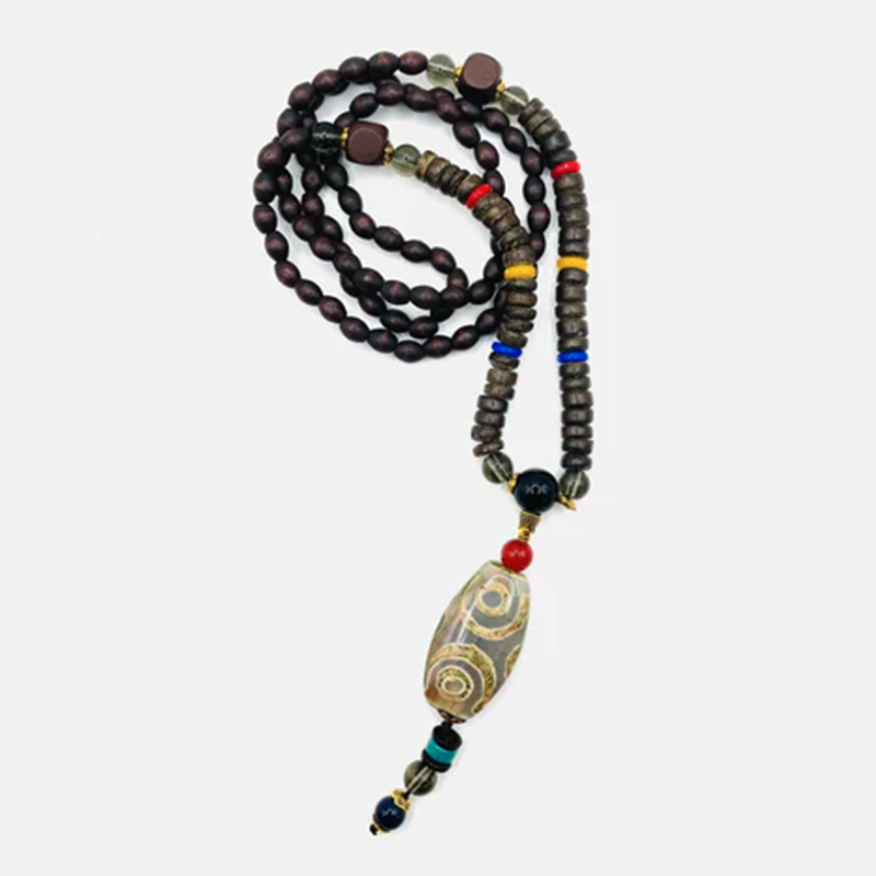 Sichere SSL-ZahlungDiese tibetische Mala „Celestial Eye“ bezieht ihre Kraft aus einem der ältesten und heiligsten Symbole der Himalaya-Kultur: der Dzi-Perle , hier dargestellt durch einen großen ovalen Stein mit eingravierten Schutzaugen. Dieses kraftvolle Juwel, zugleich mystisch und natürlich, ist auf einer Halskette aus dunklen Holzperlen montiert, verziert mit bunten Einlagen, die die Energien der fünf Elemente darstellen.