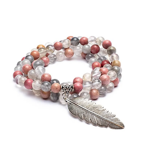 • Mala aus 108 Perlen aus Rosenquarz-, Achat- und Rhodochrositperlen