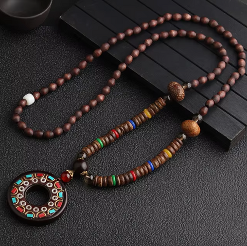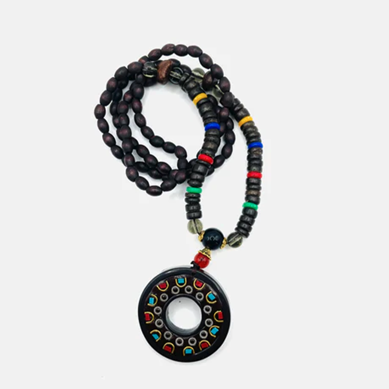 Halskette aus Holzperlen und buntem Harz , im Geiste tibetischer Ritualketten