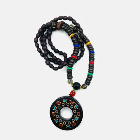 Runder Anhänger aus dunklem Holz , eingelegt mit farbigen Symbolen: Rot (Vitalität), Türkis (Schutz), Blau (Weisheit), Elfenbein (Reinheit)