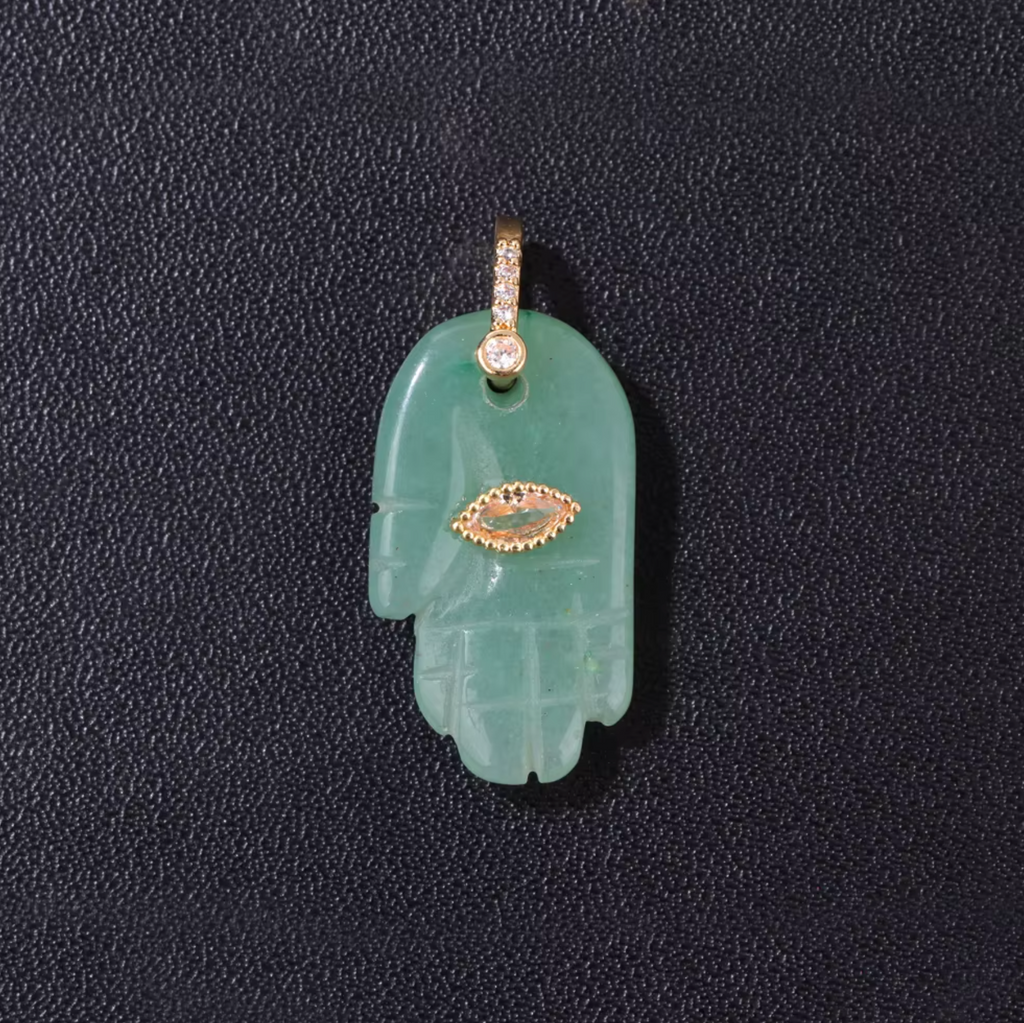 Eine Kombination kraftvoller Symbole : Die Hand der Fatima und grüner Aventurin bieten gemeinsam Schutz und Wohlstand.