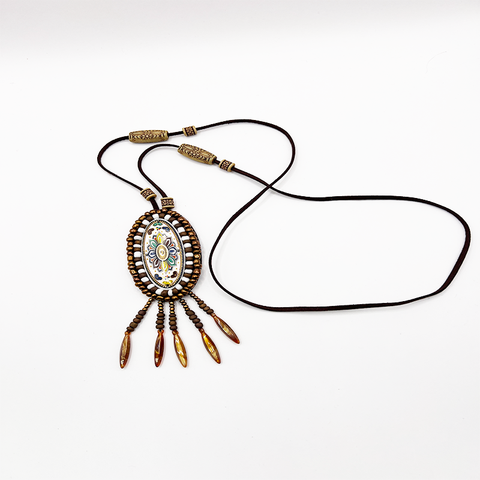 - Materialien: Leder, Cloisonné-Emaille, Naturholzperlen, Glas, vergoldetes Metall