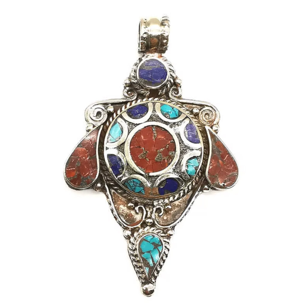 Sichere SSL-ZahlungEntdecken Sie diesen prächtigen tibetischen Anhänger aus Natursteinen , ein außergewöhnliches handgefertigtes Stück, inspiriert von den spirituellen Traditionen des Himalaya. Dieses einzigartige Schmuckstück, verziert mit Halbedelsteinen und traditionellen Motiven, soll seinem Träger Ausgeglichenheit und Schutz schenken.