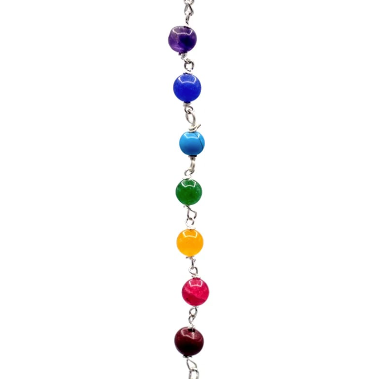- Messingkette verziert mit 7 Chakra-Steinen: Amethyst, Rosenquarz, blauer Aventurin, grüner Aventurin, Lapislazuli, Karneol und roter Jaspis.