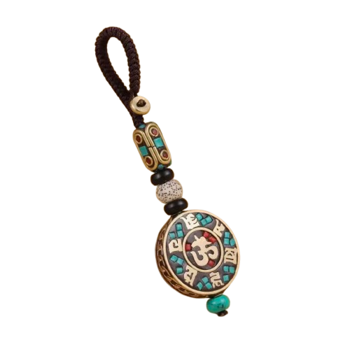 Sichere SSL-ZahlungDieser einzigartige tibetische Schlüsselanhänger ist mehr als nur ein Accessoire: Er ist ein wahrer Talisman der Weisheit, des Schutzes und des inneren Friedens . Er ist handgefertigt und hebt das kraftvolle Om-Symbol in der Mitte einer Scheibe hervor, die mit Fragmenten aus Türkis und rekonstruierter Koralle verziert und von den tibetischen Buchstaben des heiligen Mantras umgeben ist.