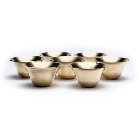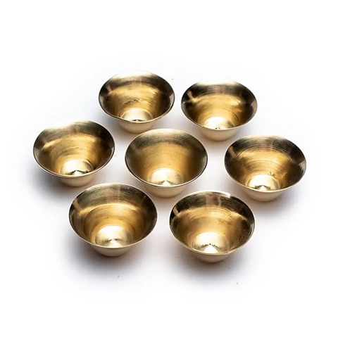 Dieses Set aus 7 Opferschalen aus Messing ist ein wesentliches Element jeder buddhistischen oder meditativen Praxis und trägt dazu bei, einen heiligen Raum zu schaffen, der dem spirituellen Erwachen und dem Empfang göttlicher Segnungen förderlich ist.