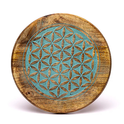 Sichere SSL-Zahlung Verleihen Sie Ihrem Zuhause einen Hauch spiritueller Eleganz mit diesem Beistelltisch aus Mangoholz, in den die blaue Blume des Lebens eingraviert ist . Perfekt als Dekorationselement , als Unterlage für heilige Gegenstände oder als kleiner persönlicher Altar vereint er handwerkliche Schönheit mit kraftvoller Symbolik. Sein natürliches Holz mit warmen Farbtönen kontrastiert harmonisch mit dem türkisfarbenen Motiv in der Mitte und sorgt für eine sanfte und zugleich lebendige Präsenz in Ihrem Raum.